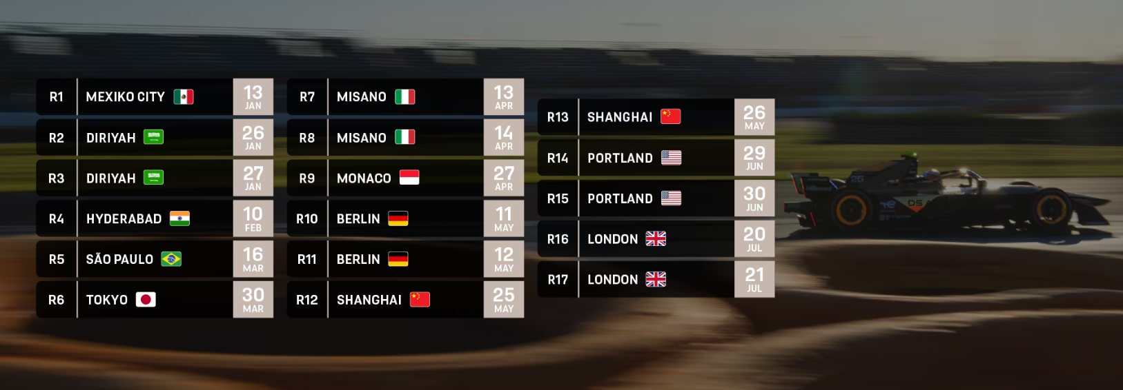 17 Rennen in 11 Ländern auf 4 Kontinenten – die bisher längste Saison in der Geschichte der ABB FIA Formel E Weltmeisterschaft verspricht spannungsgeladene Rennaction und jede Menge Positionskämpfe Rad an Rad. Mit unserem Rennkalender verpassen Sie kein Rennen!